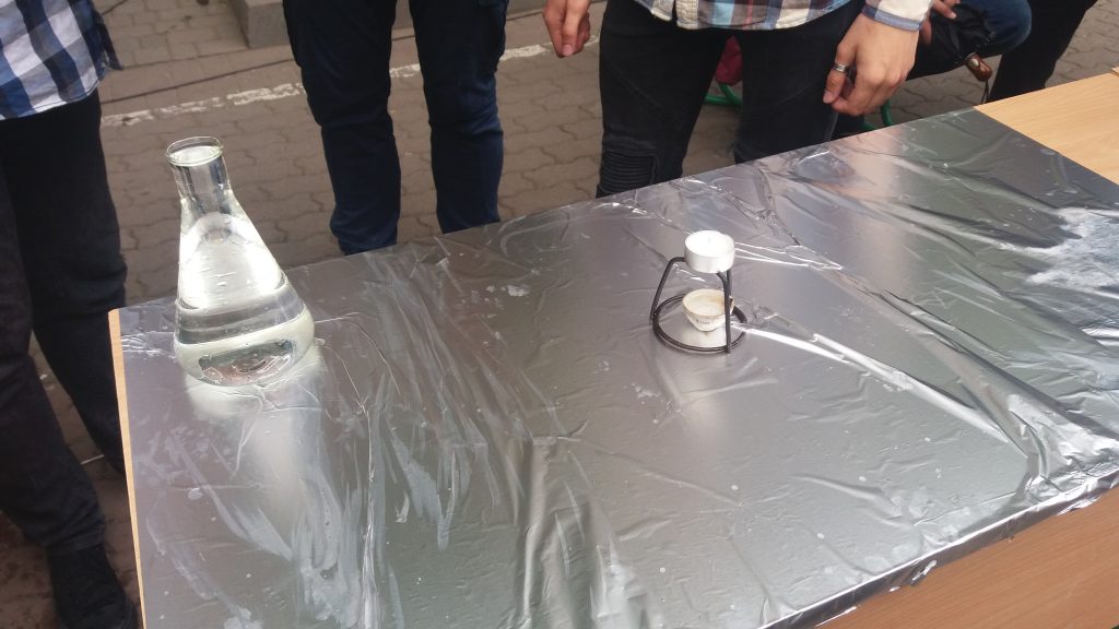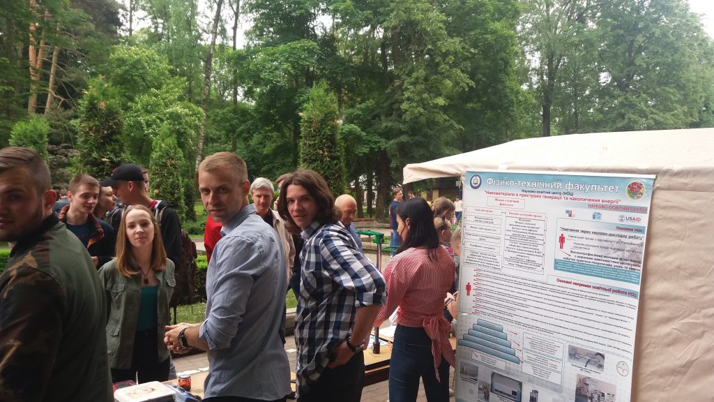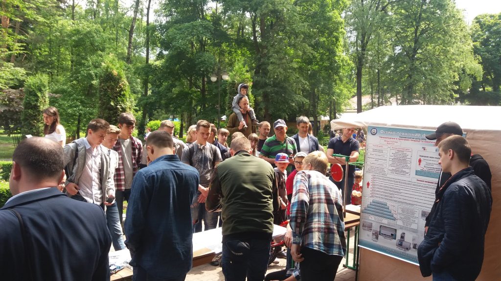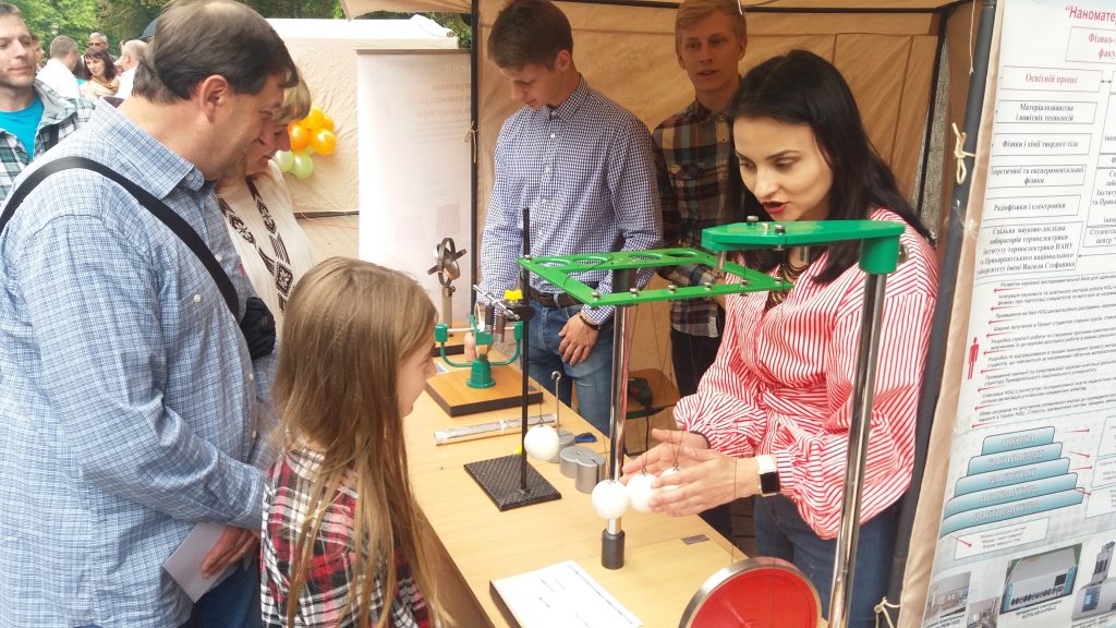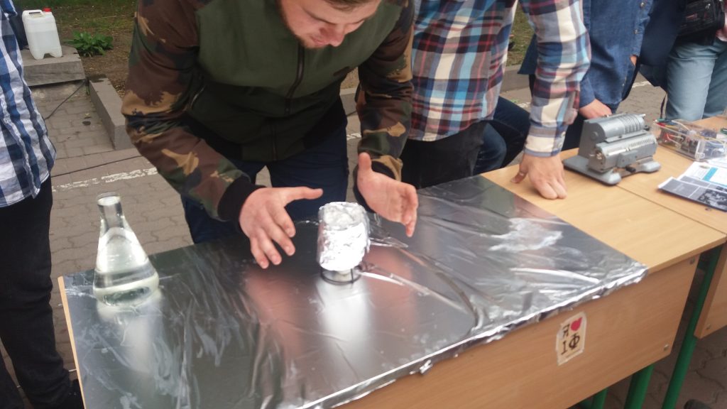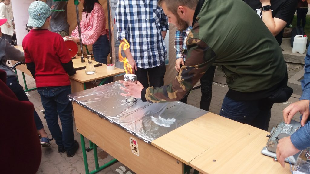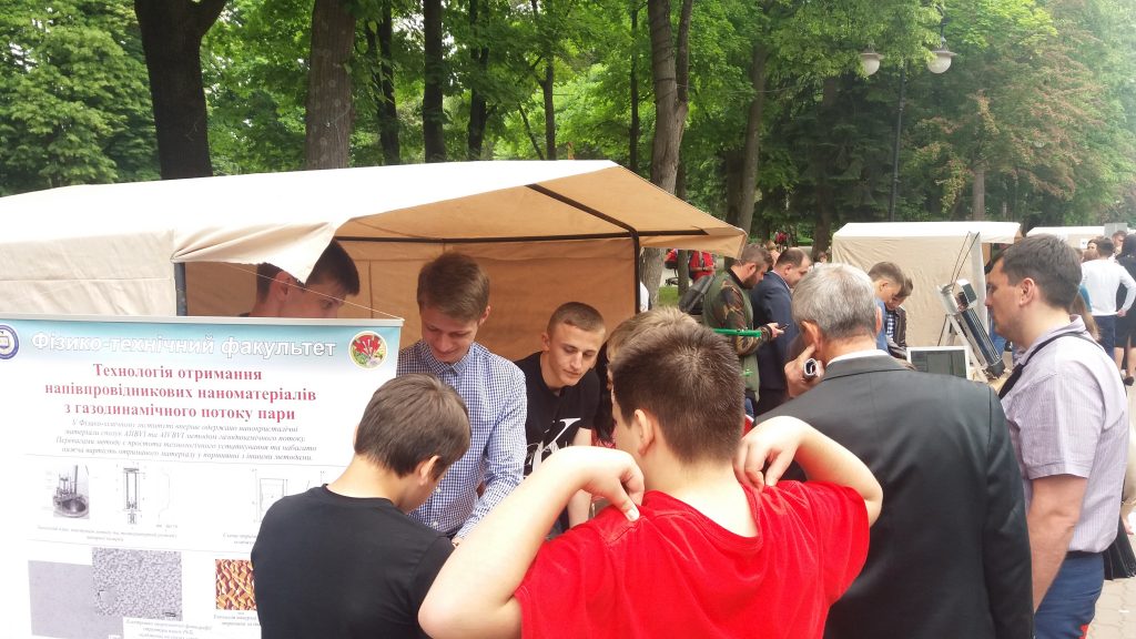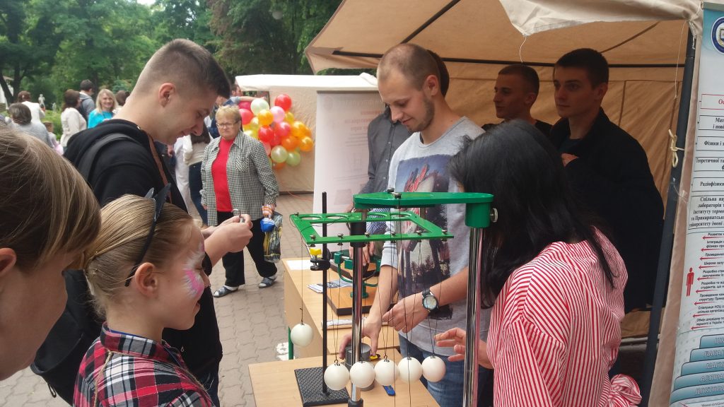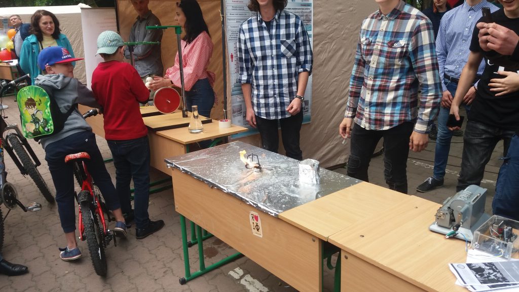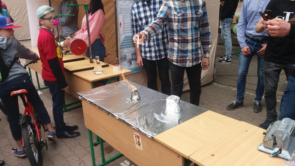 На експозиціях Фізико-технічного факультету було представлено ряд цікавих фізичних експериментів, зокрема: маятник Максвелла, кульки Ньютона, дво- і триступеневі гіроскопи, демонстрацію молекулярної взаємодії двох свинцевих циліндрів, «палаючу гривню», вибух свічки, вулкан Шеєле і горіння металів.