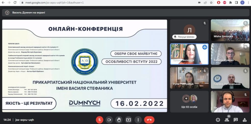 16 лютого 2022 року в Прикарпатському національному університеті імені Василя Стефаника відбулася онлайн-конференція «Обери своє майбутнє» та «Особливості вступу 2022» для учнів 9-11 класів, закладів загальної середньої освіти Закарпатської області. В заході взяли участь понад 160 учасників, зокрема учні 9-11 Читати далі