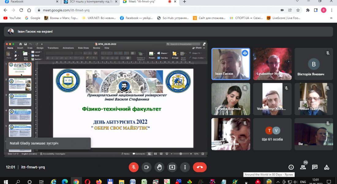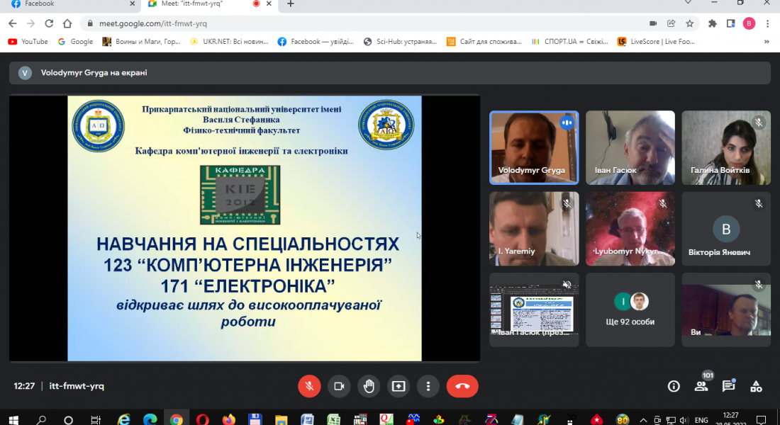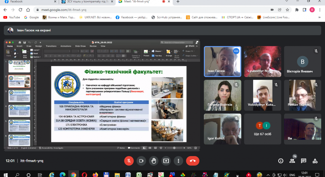 На початку зустрічі до учнів шкіл з вітальним словом звернувся декан фізико-технічного факультету Іван Гасюк. Іван Михайлович наголосив на важливості розвитку фізичних та технічних спеціальностей в нашому Університеті та Україні, особливо в сьогоднішніх обставинах та продемонстрував презентаційну доповідь про структуру факультету, освітні програми за якими здійснюється підготовка здобувачів вищої освіти, матеріально-технічну базу, академічну мобільність здобувачів та викладачів, працевлаштування випускників, наукові напрямки викладачів, аспірантів та студентів, тощо. Далі презентаційні виступи мали представники кафедр, які готують здобувачів за відповідними освітньо-професійними програмами на фізико-технічному факультеті.