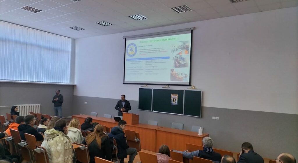 Про фізико-технічний факультет розповів відповідальний за профорієнтаційну роботу факультету, доцент кафедри комп’ютерної інженерії та електроніки Грига В.М., який представив презентацію про спеціальності і освітні програми ФТФ, за якими здійснюється підготовка здобувачів освіти на бакалаврському та магістерському рівні. Учні та вчителі ліцеїв також були проінформовані про потужну матеріально-технічну базу лабораторій структурних підрозділів факультету, науково-дослідну роботу здобувачів вищої освіти та можливостей їхнього працевлаштування.