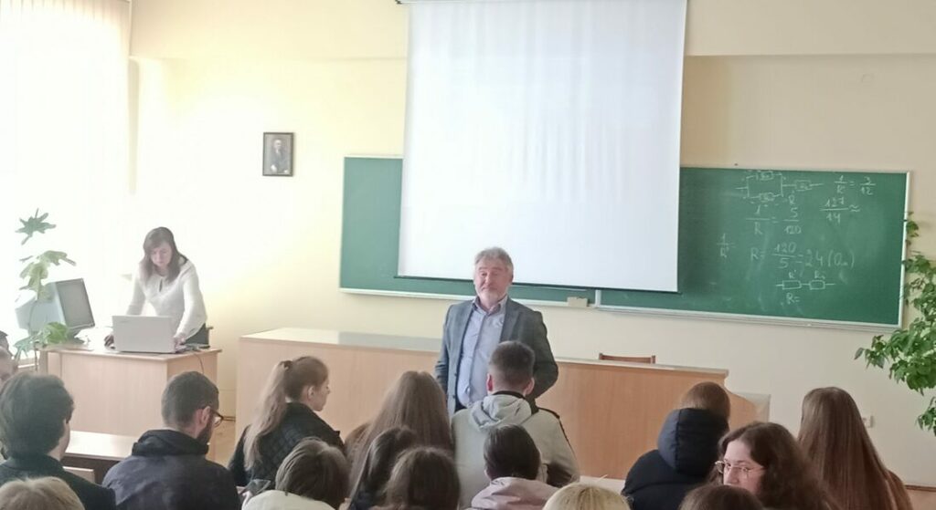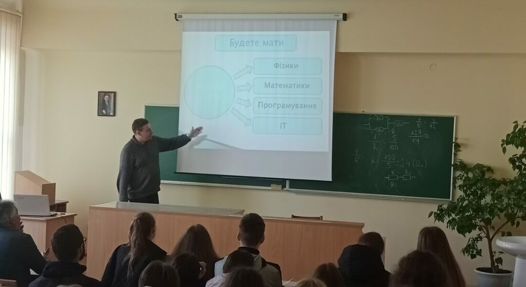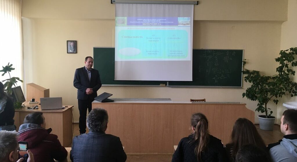 Про особливості освітніх програм ”Комп’ютерна інженерія” та ”Електроніка” розповів доцент кафедри комп’ютерної інженерії та електроніки Грига Володимир Михайлович. Здобуваючи освітній рівень бакалавра перед випускниками даних ОП відкриваються широкі можливості працевлаштування на високооплачувану роботу в галузі інформаційних технологій, електроніки та телекомунікацій. Учням було продемонстровано структуру даних ОП, викладацький склад, який здійснює підготовку здобувачів вищої освіти, можливості працевлаштування випускників, співпрацю кафедри КІЕ із зарубіжними фірмами виробниками апаратного і програмного забезпечення яке впроваджене в навчальний процес та організацію проведення виробничих практик на підприємствах м. Івано-Франківськ.