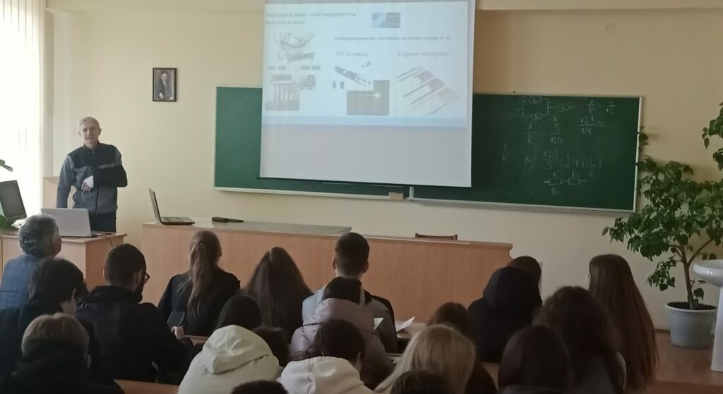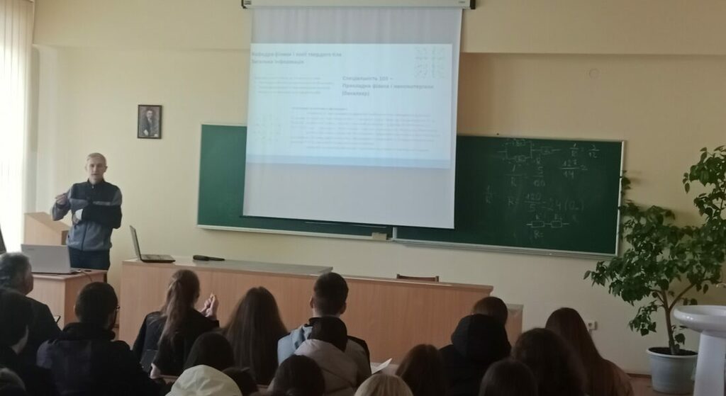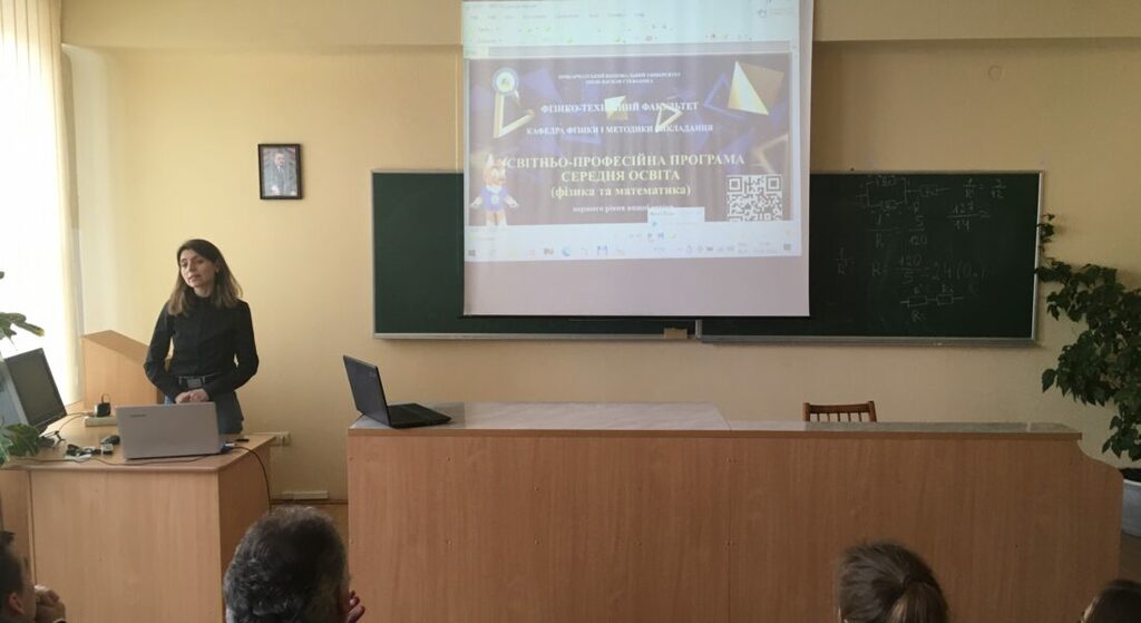 Завідувач кафедри фізики і хімії твердого тіла, професор Никируй Любомир Іванович, розповів учасникам заходу про освітні програми ”Медична фізика” і ”Матеріали та пристрої відновлювальної енергетики”, навчання на яких відбувається за спеціальністю 105 Прикладна фізика та наноматеріали. Любомир Іванович представив обов’язкові освітні компоненти за якими здійснюється підготовка здобувачів вищої освіти на даних ОП, розповів про наукову роботу здобувачів освіти даних ОП і можливості їх працевлаштування, академічну мобільність, організацію науково-популярних лекцій для студентів кафедри фізики і хімії твердого тіла провідними науковцями зарубіжних ЗВО, відомих випускників кафедри, міжнародні контакти та окреслив перспективи подальшої міжнародної співпраці із закладами вищої освіти США та Європи.
