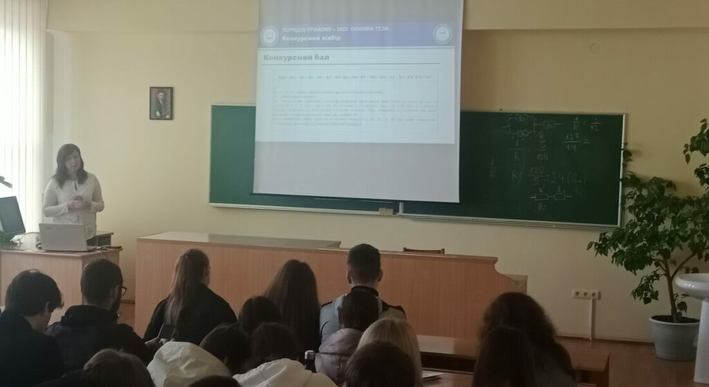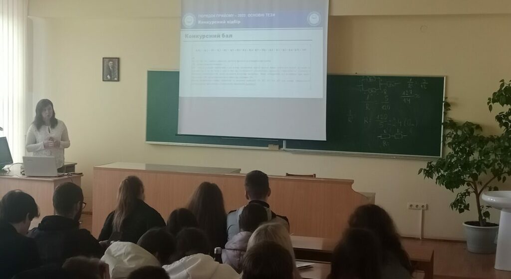 З презентаційною доповіддю, про вступ до Університету, виступила заступник відповідального секретаря приймальної комісії Прикарпатського національного університету імені Василя Стефаника, д.ф-м.н., професор Бойчук Володимира Михайлівна. Учні дізналися про обов’язкові та вибіркові предмети, з яких будуть проходити тестування для вступу на 1-ий курс, при здачі національного мультипредметного тесту (НМТ), терміни реєстрації електронних кабінетів, графіки проведення основної і додаткової сесії НМТ, вагові коефіцієнти та методику розрахунку конкурсного балу за відповідною спеціальністю, складання та перевірку мотиваційних листів, порядок подання заяв для вступу на освітній рівень “бакалавр” та зазначення їх пріоритетності.
